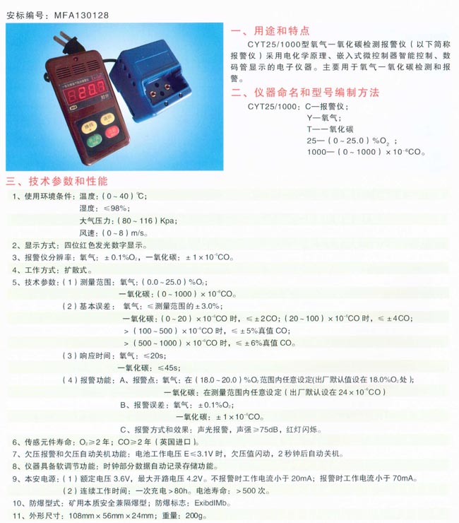 | 其他气体检测仪 >> CYT25/1000氧气一氧化碳检测报警仪 |
